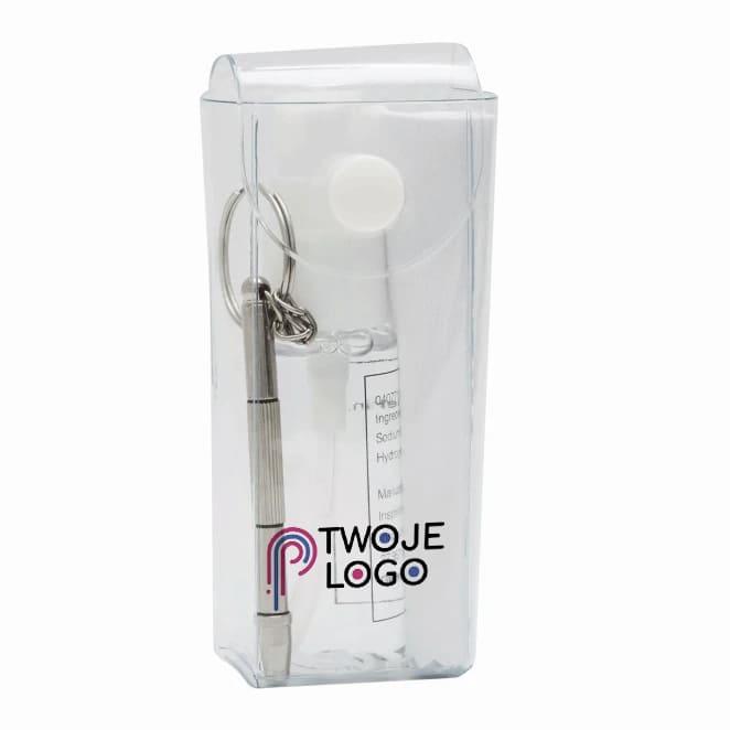 Zestaw do czyszczenia okularów VIEW zawiera spray z detergentem (około 20 ml), ściereczkę do czyszczenia szkła, mini śrubokręt z breloczkiem. W torbie PVC na zatrzask.