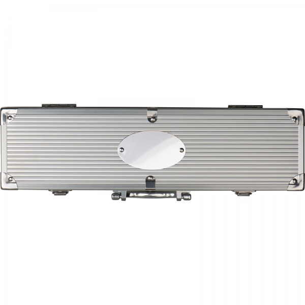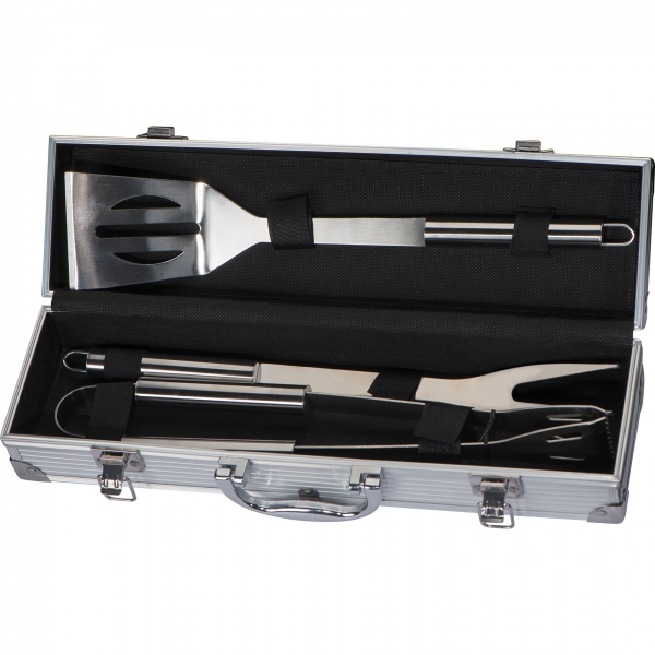 Zestaw metalowych przyborów do grilla (szczypce do obracania mięsa, łopatka i widelec) w metalowej skrzynce.