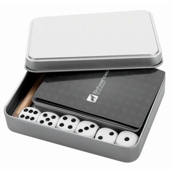 Podróżny zestaw do gier, zapakowany w blaszane pudełko. Wewnątrz znajduje się talia 54 kart z wodoodporną powierzchnią, 6 kości do gry, 15 kartek oraz ołówek. Rozmiar pudełka - 8,5 x 11 x 2 cm, karty - 6,2 x 8,7 cm.
