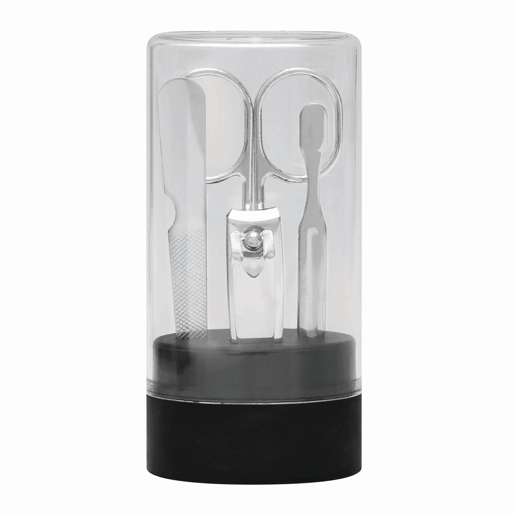 Zestaw do manicure LYON z 4 elementami. Zawiera pilniczek do paznokci, cążki, nożyczki do paznokci i popychacz do skórek. W przezroczystym opakowaniu.