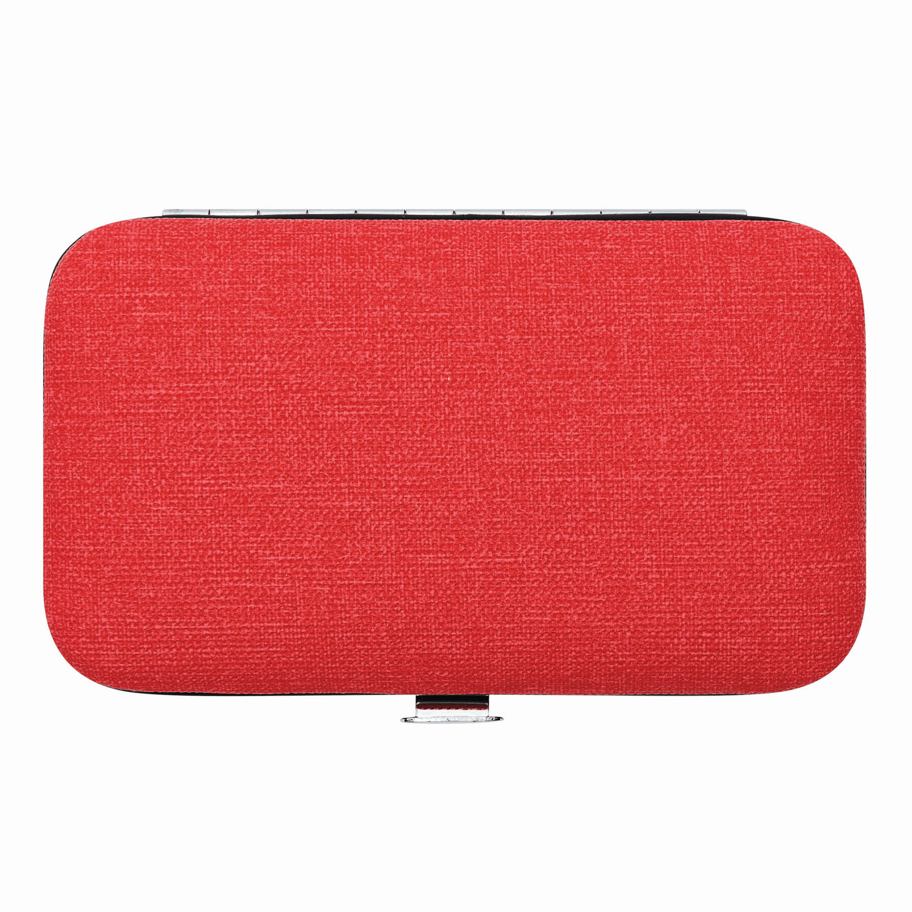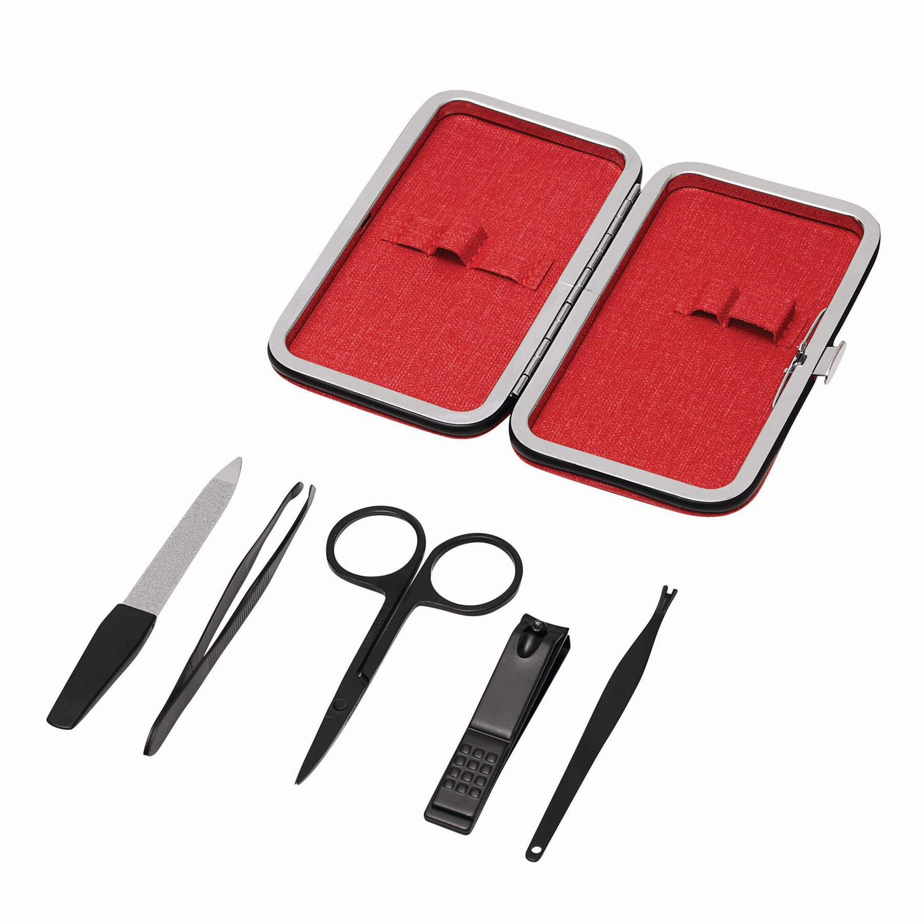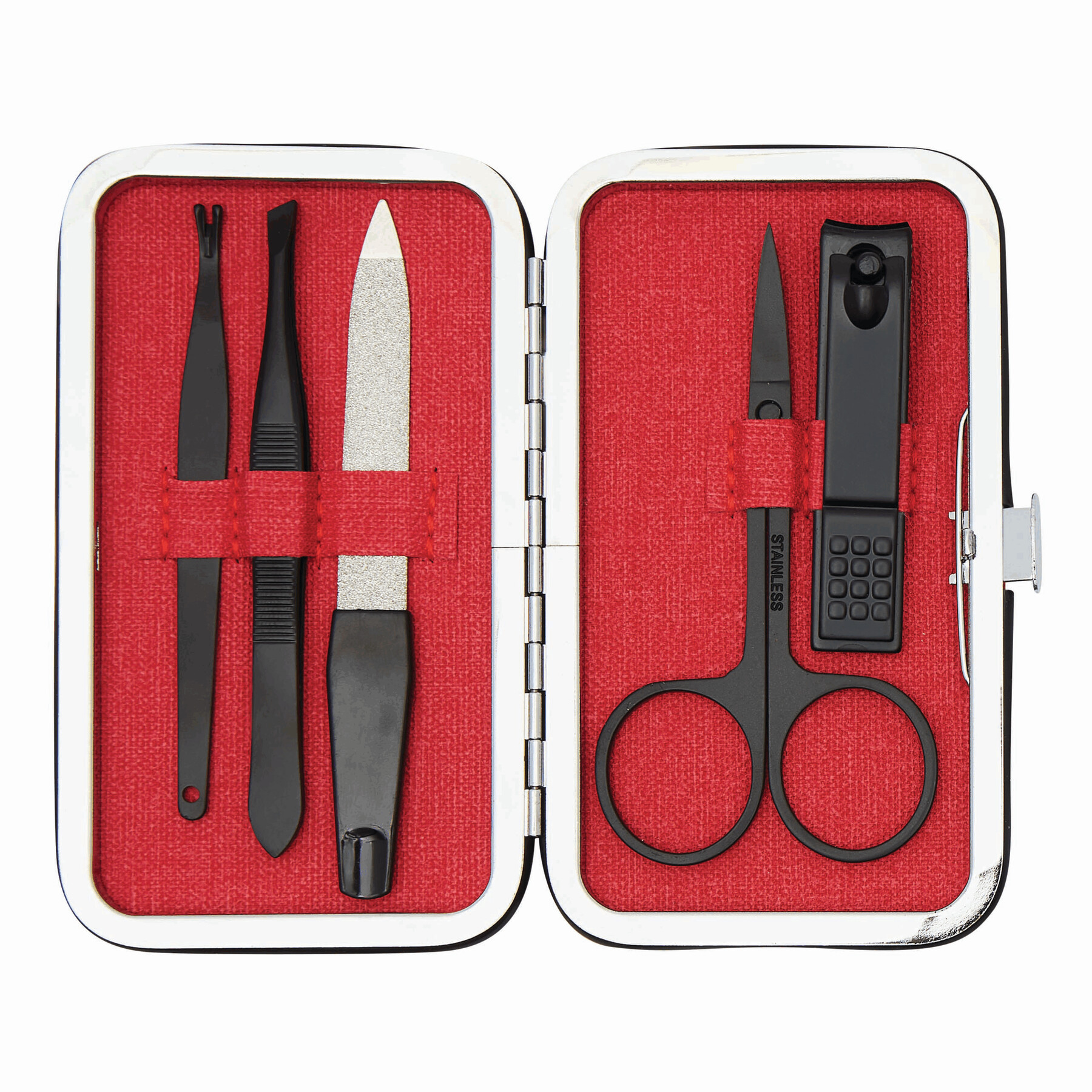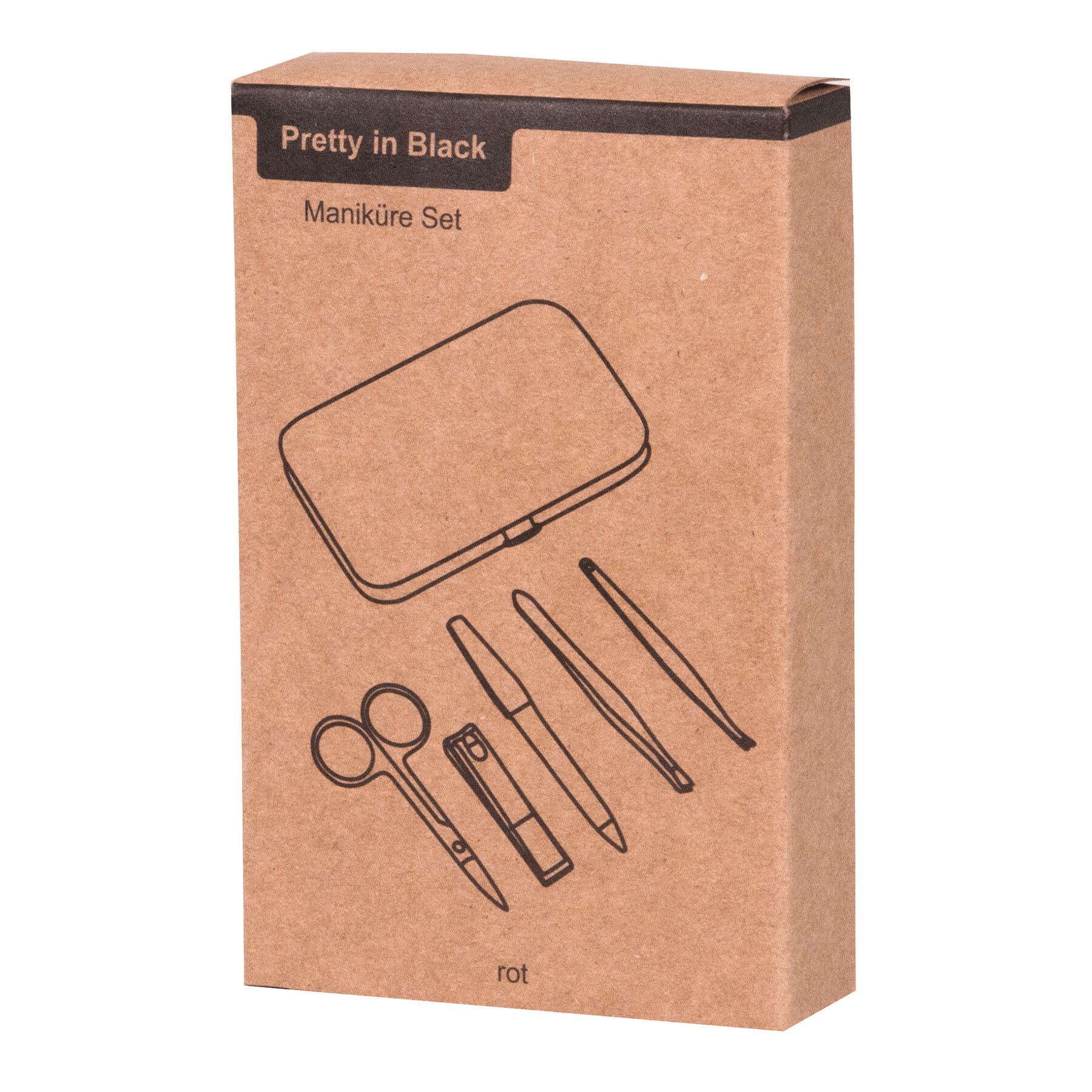 Zestaw do manicure PRETTY IN BLACK składający się z 5 elementów. Zawiera pilniczek do paznokci, pęsetę, nożyczki do skórek i paznokci, cążki oraz radełko do skórek. W prostokątnym etui z przyciskiem z boku.