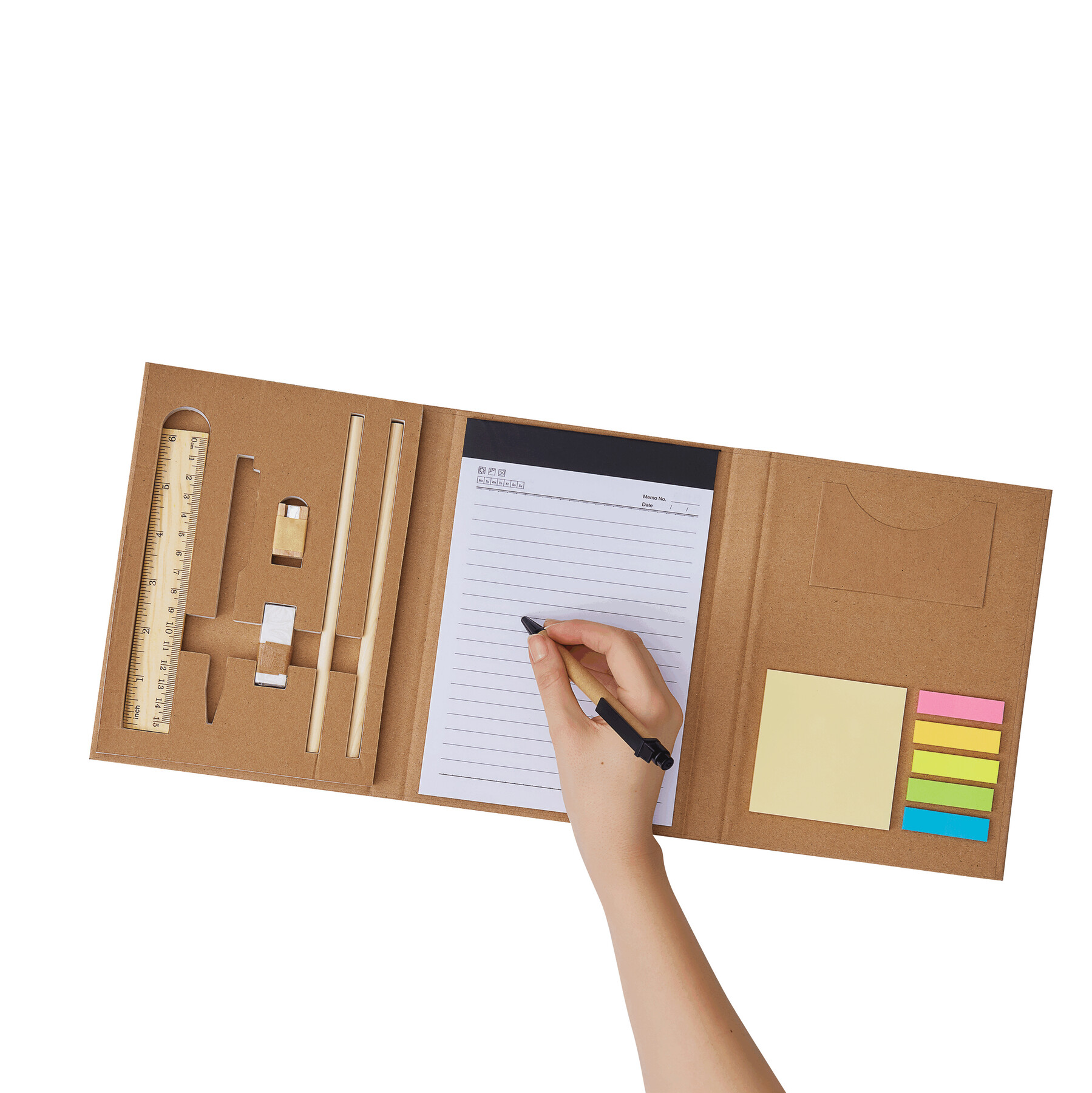 Zestaw do pisania SCHOOL DAYS zawiera tekturowy długopis (niebieski wkład), linijkę (15 cm), drewnianą temperówkę, gumkę, dwa drewniane ołówki, 1 notatnik w linie, samoprzylepne, kolorowe bloczki indeksujące strony i kieszeń na wizytówki.