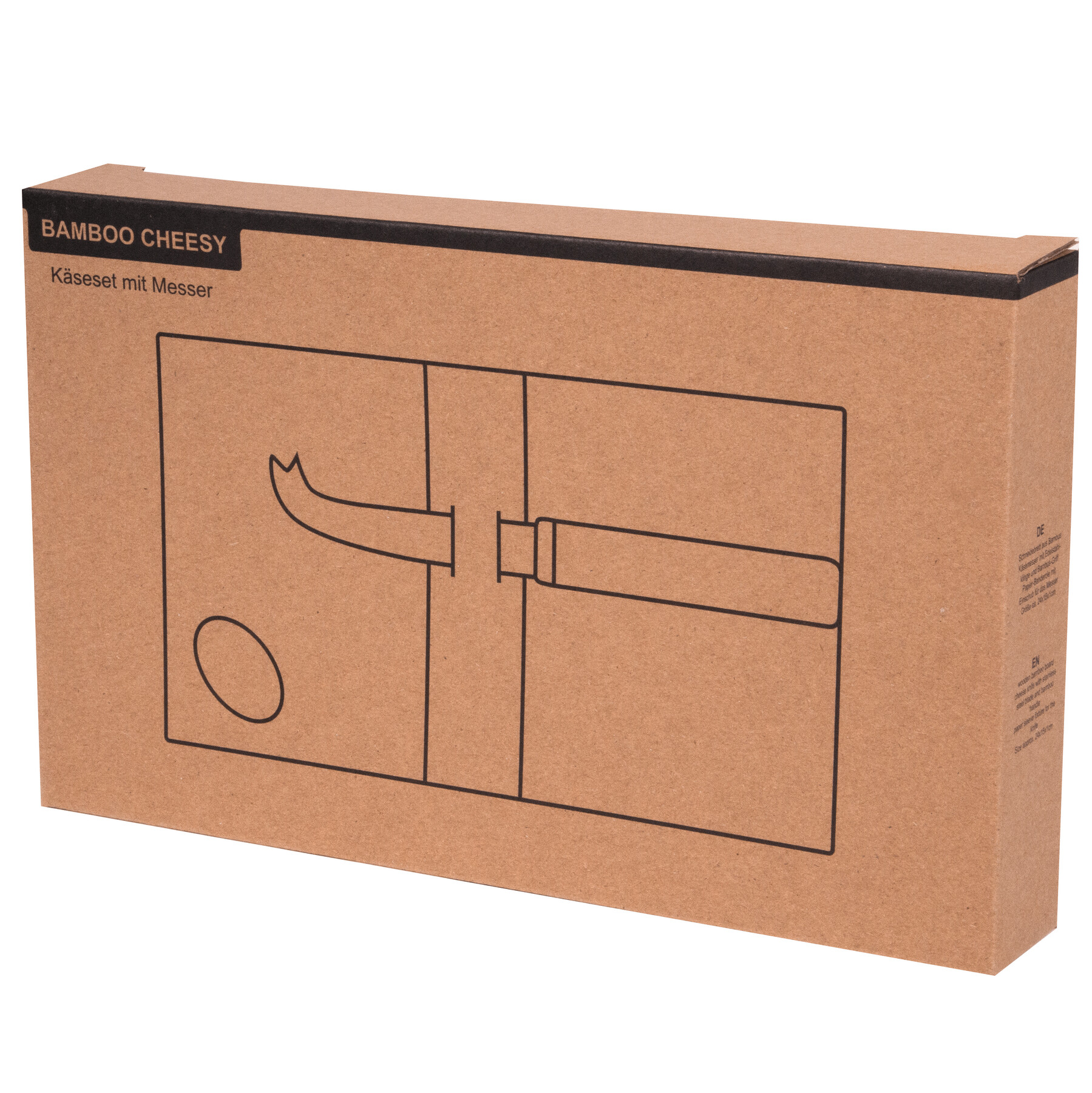 Zestaw do serów BAMBOO CHEESY: deska do krojenia wykonana z bambusa, nóż do sera z ostrzem ze stali nierdzewnej i bambusową rączką, papierowa banderola z wkładką na nóż.