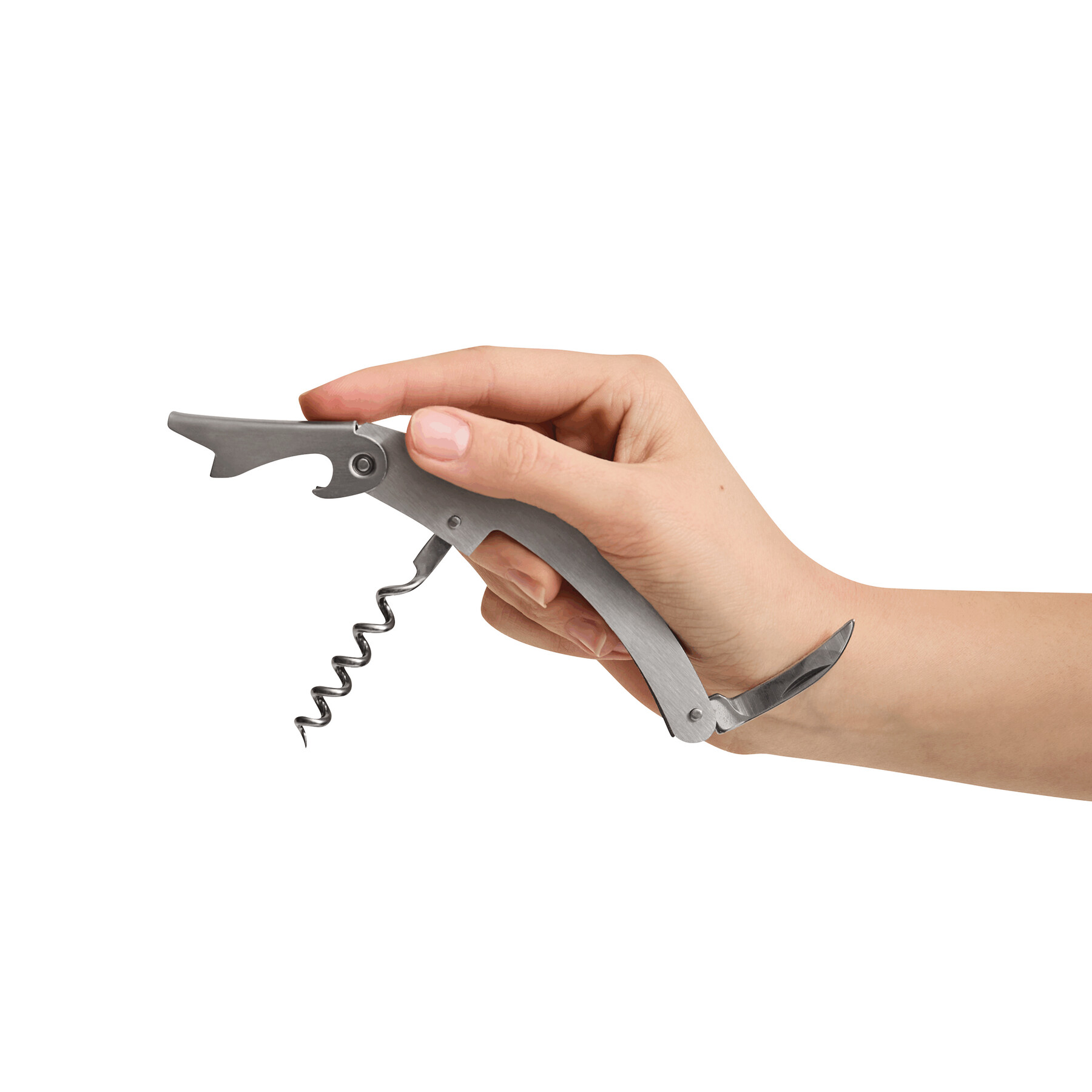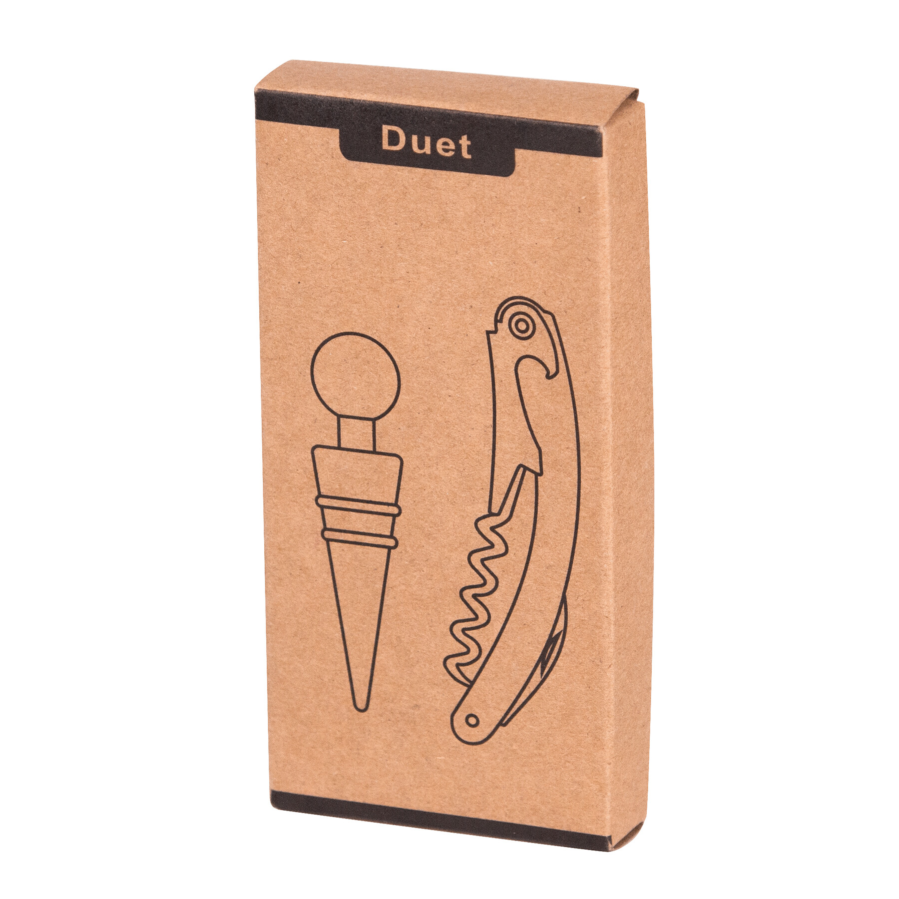 Zestaw do win DUET w czarnym pudełku z korkociągiem, otwieraczem do butelek, nożykiem i korkiem.