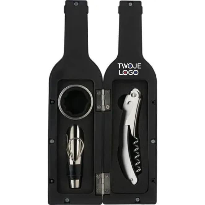 Zestaw do wina, 3 el. w pudełku w kształcie butelki, nóż kelnerski, zatyczka do butelki z nalewakiem, pierścień