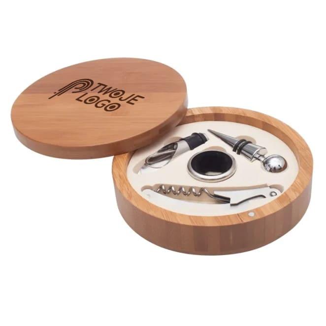 Zestaw do wina w pudełku z drewna bambusowego. Składa się z otwieracza, okapnika, nalewaka z zatyczką i zatyczki.