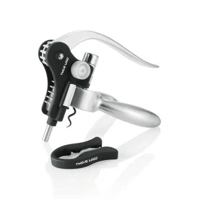 Zestaw do wina, korkociąg z aluminiowym mechanizmem podnoszącym, spirala stalowa, pokryta teflonem, nożyk do folii, w komplecie ozdobne pudełko oraz przegląd najlepszych regionów winnych roku 1990, ślad węglowy produktu: 3,82 kg CO2