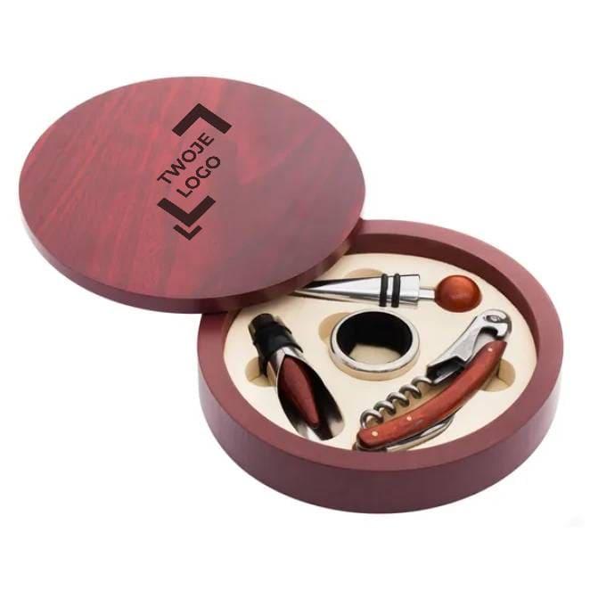 Zestaw do wina składający się z otwieracza, okapnika, nalewaka i zatyczki.