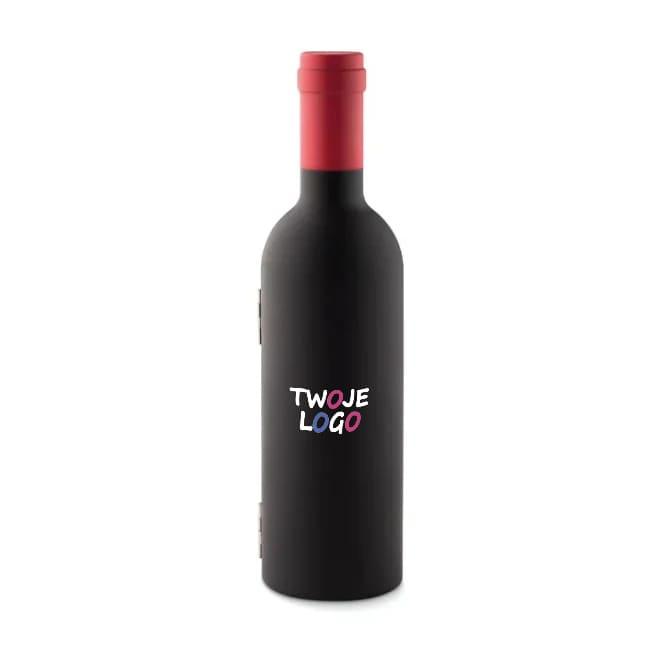 Zestaw do wina zapakowany w pudełko w kształcie butelki, składający się z korka do wina, korkociągu oraz okapnika. Magnetyczne zapięcie.