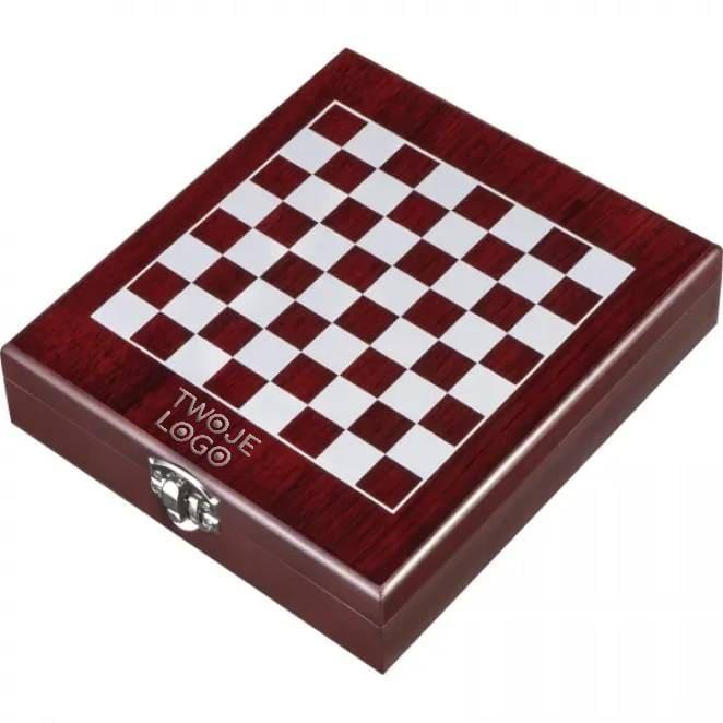 Zestaw do wina w drewnianym pudełku z dołączonymi drewnianymi szachami. W pudełku znajdują się: nóż kelnerski, korek, termometr i ociekacz.