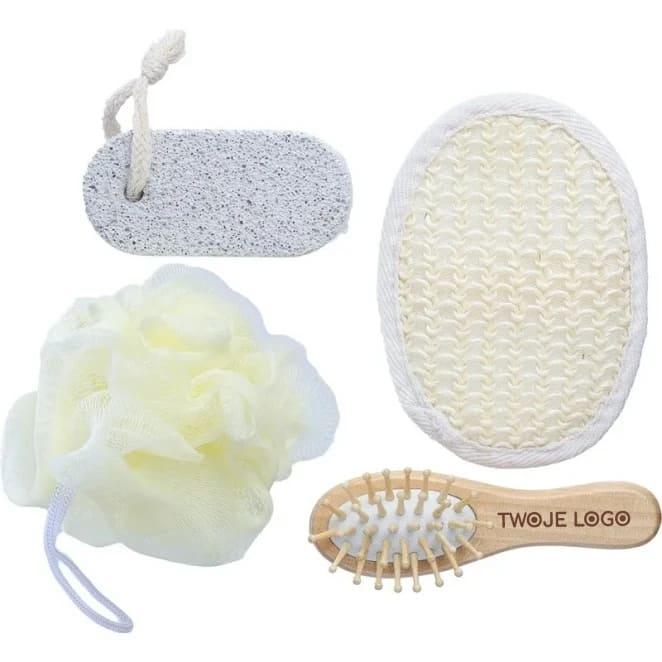 Zestaw kąpielowy, składa się ze szczotki bambusowej, miękkiej gąbki, gąbki do szorowania i pumeksu, wszystkie elementy zapakowane w bawełniany woreczek, produkt wykonany z bawełny, drewna i PE