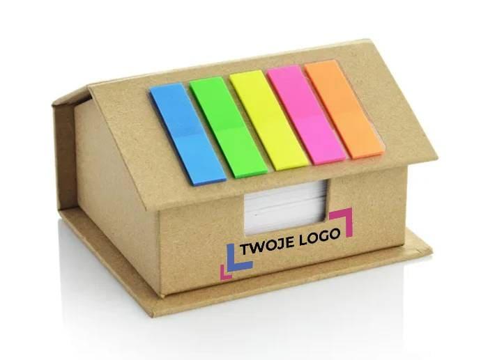 Ekologiczny pojemnik na karteczki ( 370 szt.) w kształcie domku. Dodatkowo znaczniki samoprzylepne w pięciu kolorach (po 25 znaczników w każdym kolorze). Logo wykonamy na powierzchni dachu.