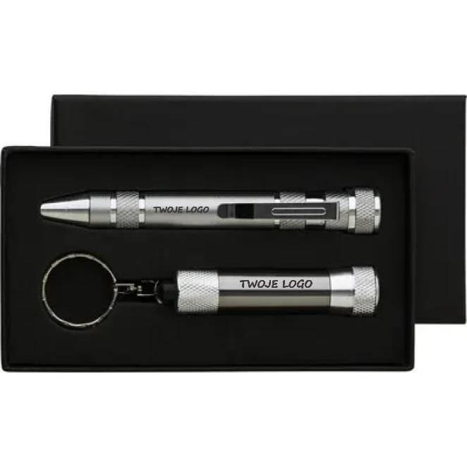 Zestaw w pudełku: śrubokręt z 8 wymiennymi końcówkami i latarka kieszonkowa 3 LED na breloku