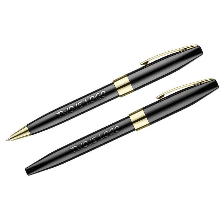 Komplet piśmienniczy ze złotymi wykończeniami pakowany w etui wykonane z eleganckiego czarnego weluru. W komplecie znajduje się długopis oraz pióro kulkowe. Logo wygrawerujemy w kolorze złotym na długopisie i piórze kulkowym w ich górnej części.
