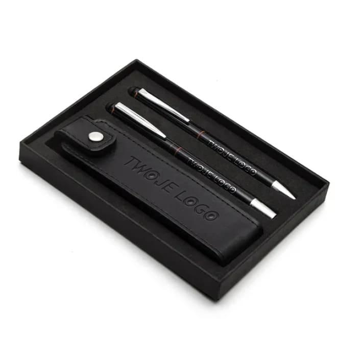 Zestaw składający się z aluminiowego długopisu i pióra kulkowego wyposażonych w końcówkę do obsługi ekranów dotykowych, pakowanych w etui z ekoskóry. Chromowane dodatki. Wkład do długopisu o średnicy 1,00 mm w kolorze niebieskim, nabój o średnicy 0,7 mm do pióra kulkowego także w kolorze niebieskim. Pakowany w czarne opakowanie upominkowe.