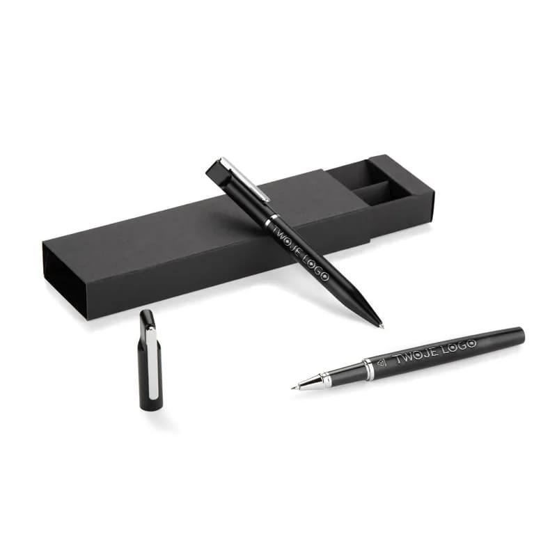 Zestaw piśmienniczy EFAN to stylowy komplet składający się z długopisu oraz pióra kulkowego, wykonanych z recyklingowanego aluminium. Oba elementy mają smukłą, czarną konstrukcję z matowym wykończeniem i subtelnymi srebrnymi detalami. Długopis wyposażony jest w niebieski wkład, a pióro kulkowe w czarny, oba o grubości pisania 1,0 mm i długości do 500 metrów. Całość zapakowana w czarne kraftowe pudełko papierowe.