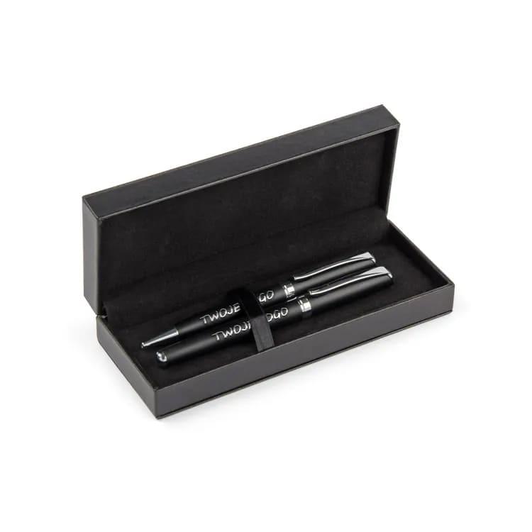 GEORGIA to elegancki zestaw piśmienniczy składający się z długopisu oraz pióra wiecznego. Przybory piśmiennicze wykonane z metalu zapakowane są w etui z czarnego materiału skóropodobnego (PU). Długopis z mechanizmem typu twist. Do pióra wiecznego dołączony jest jeden nabój z atramentem. Wkład długopisu oraz atrament naboju do pióra w kolorze czarnym.Pakowany w czarny kartonik lub biały rękaw.