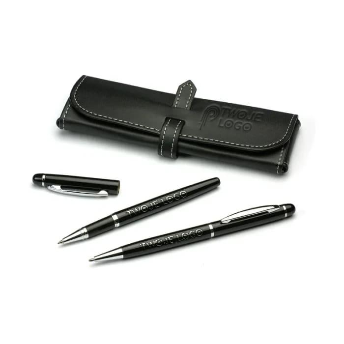 Elegancki zestaw piśmienniczy pakowany w etui z materiału skóropodobnego (PU). W zestawie znajdują się długopis oraz pióro kulkowe. Logo wygrawerujemy na powierzchni artykułów piśmienniczych. Możliwość wygrawerowania logo także na etui.