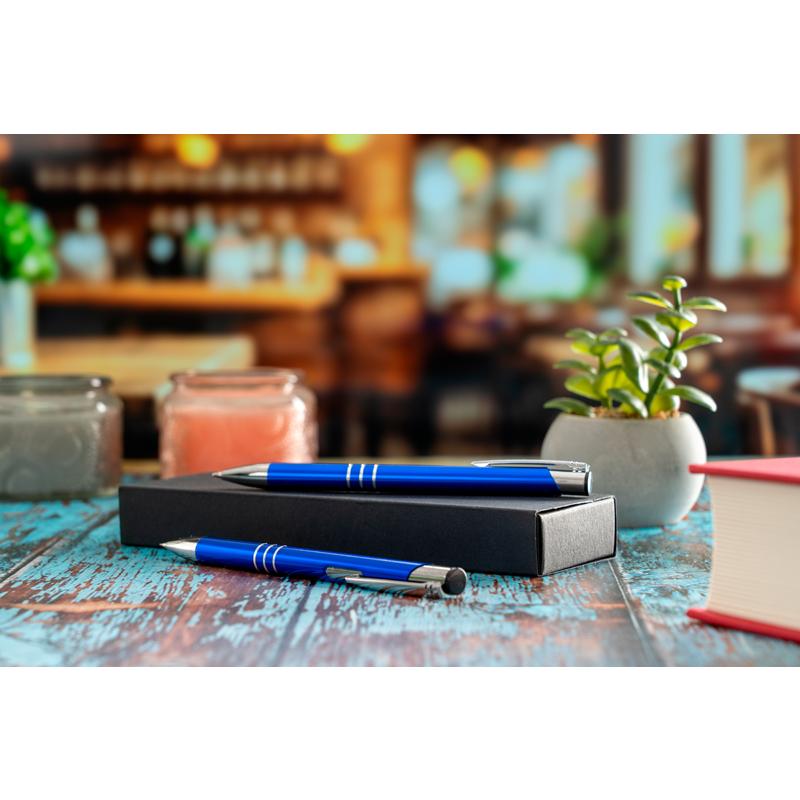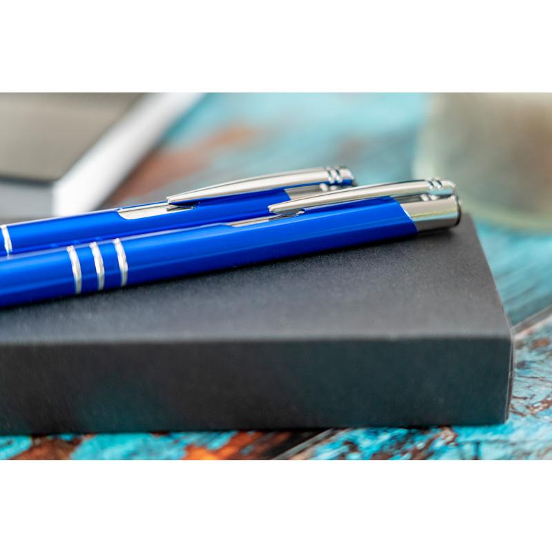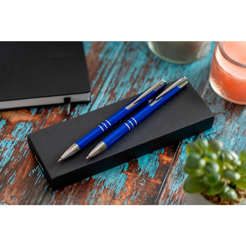 Metalowy Zestaw piśmienniczy składający się z długopisu z dużym,niebieskim wkładem oraz ołówkiem automatycznym. Całość umieszczona w etui. Dostępny w kilku kolorach.