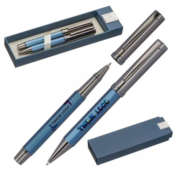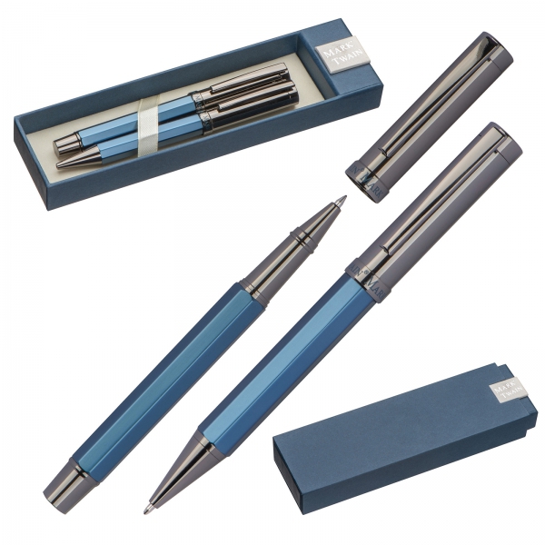 Zestaw piśmienniczy marki Mark Twain, składający się z długopisu i pióra kulkowego. Zestaw wykonany z metalu, piszący na niebiesko.