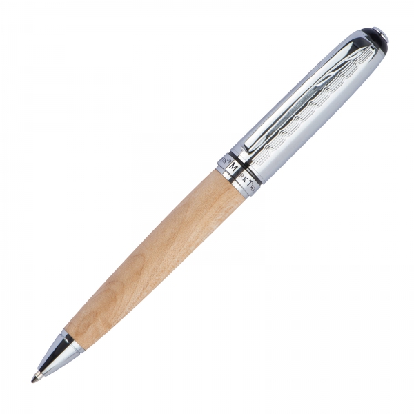 Elegancki zestaw do pisania zamknięty w pudełku z naturalnego, idealnie wyszlifowanego drewna. Wewnątrz znajduje się długopis i pióro kulkowe, oba posiadają wkłady piszące na niebiesko.