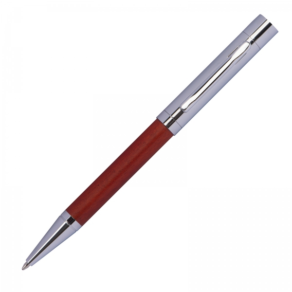 Zestaw piśmienniczy Mark Twain składający się z długopisu z dużym niebieskim wkładem i pióra wiecznego, wykonanego z metalu z drewnianym korpusem. Zestaw zapakowany jest w etui i czarne pudełko.