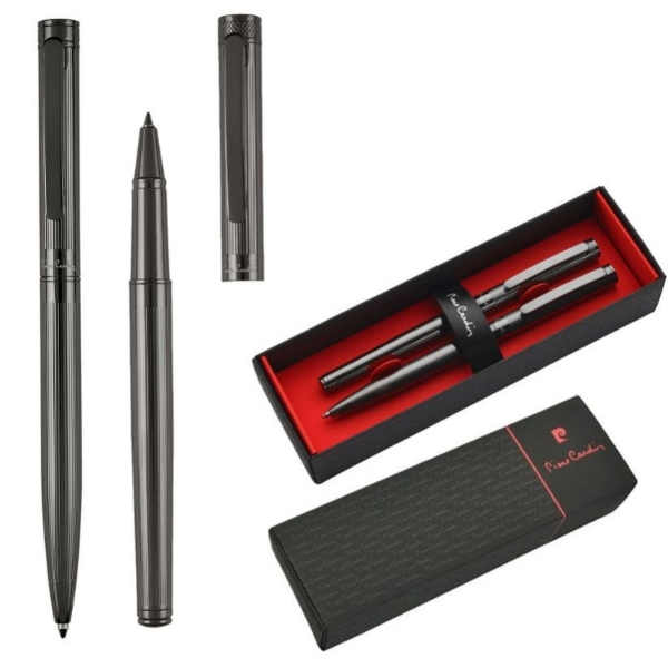 Najwyższej jakości zestaw piśmienniczy składający się z długopisu (1 mm) i pióra kulkowego (0,6 mm) pochodzących z kolekcji RENEE. Przybory piśmienne wykonane z metalu z chromowanymi elementami, obydwa piszące na niebiesko. Zestaw zapakowany w eleganckie pudełko prezentowe z certyfikatem autentyczności Pierre Cardin.