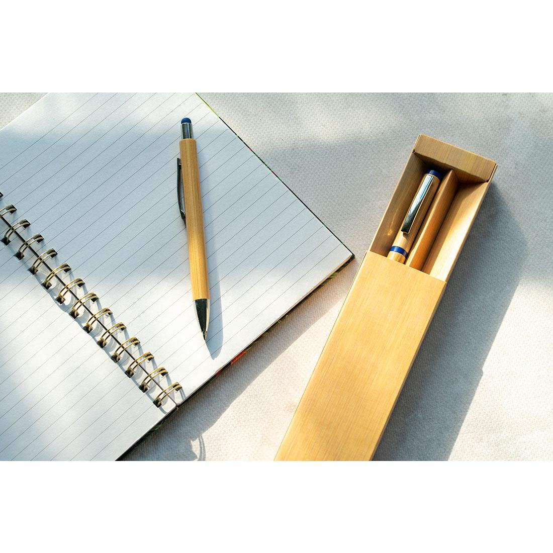 Zestaw wykonany z bambusa, metalu i plastiku, składający się z długopisu oraz pióra kulkowego z kolorowymi i srebrnymi elementami. Długopis wyposażony w końcówkę do ekranów dotykowych. Zestaw dostarczany jest w kartonowym pudełku.