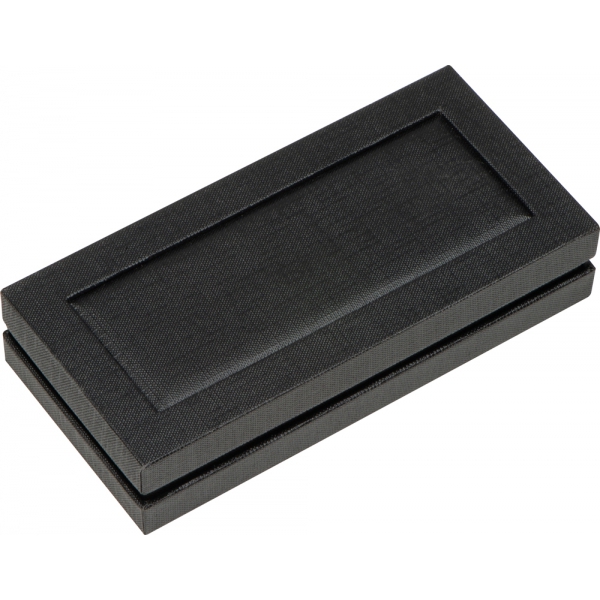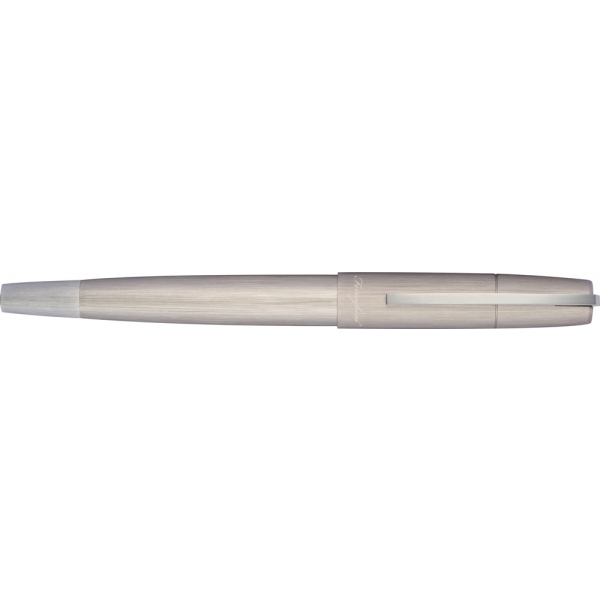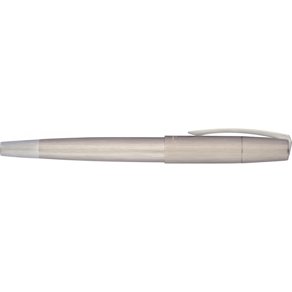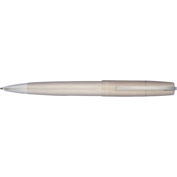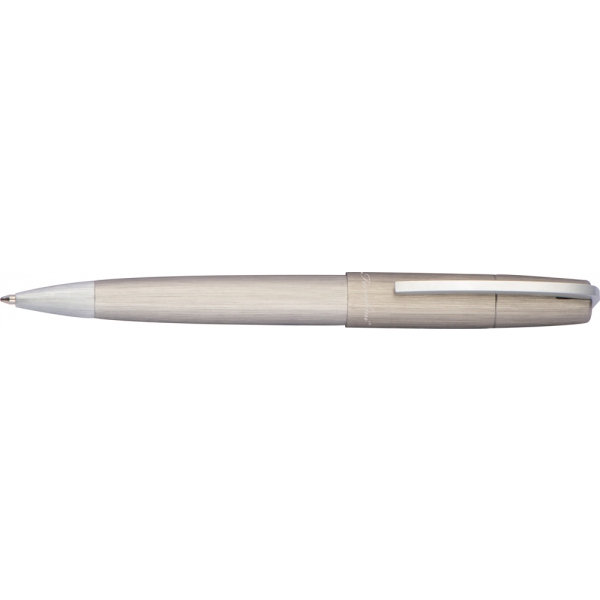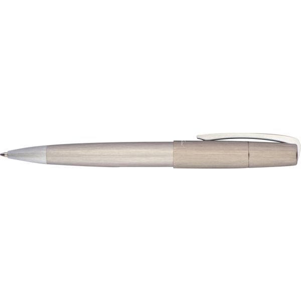 Zestaw piśmienniczy wykonany z matowego szczotkowanego metalu. Zestaw składa się z przekręcanego długopisu z niebieskim wkładem oraz pióra kulkowego.