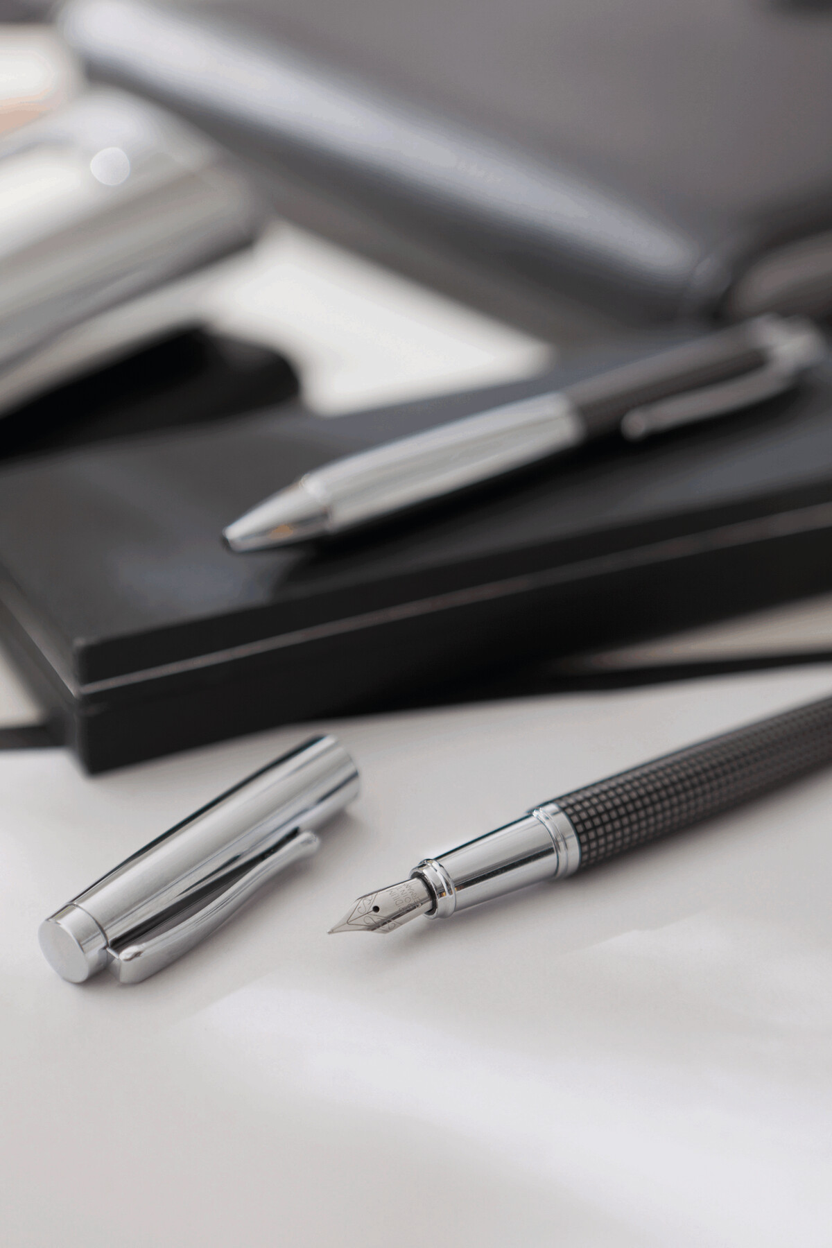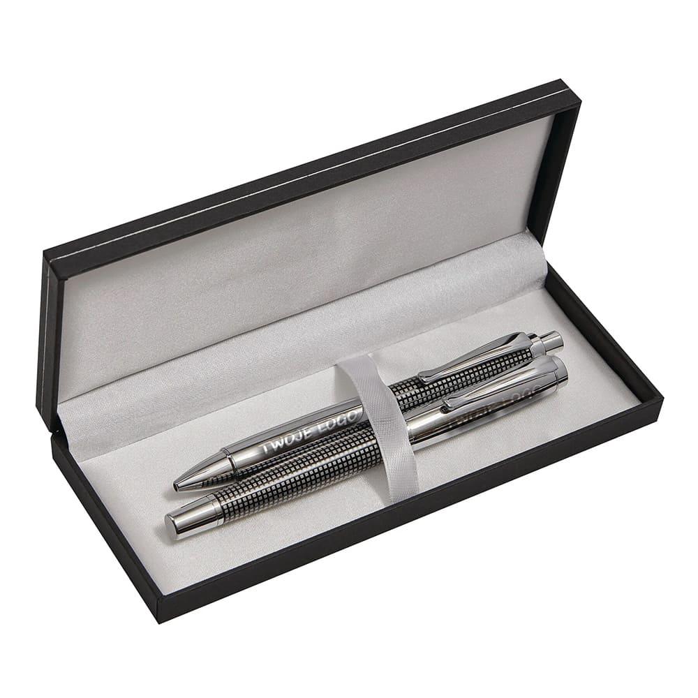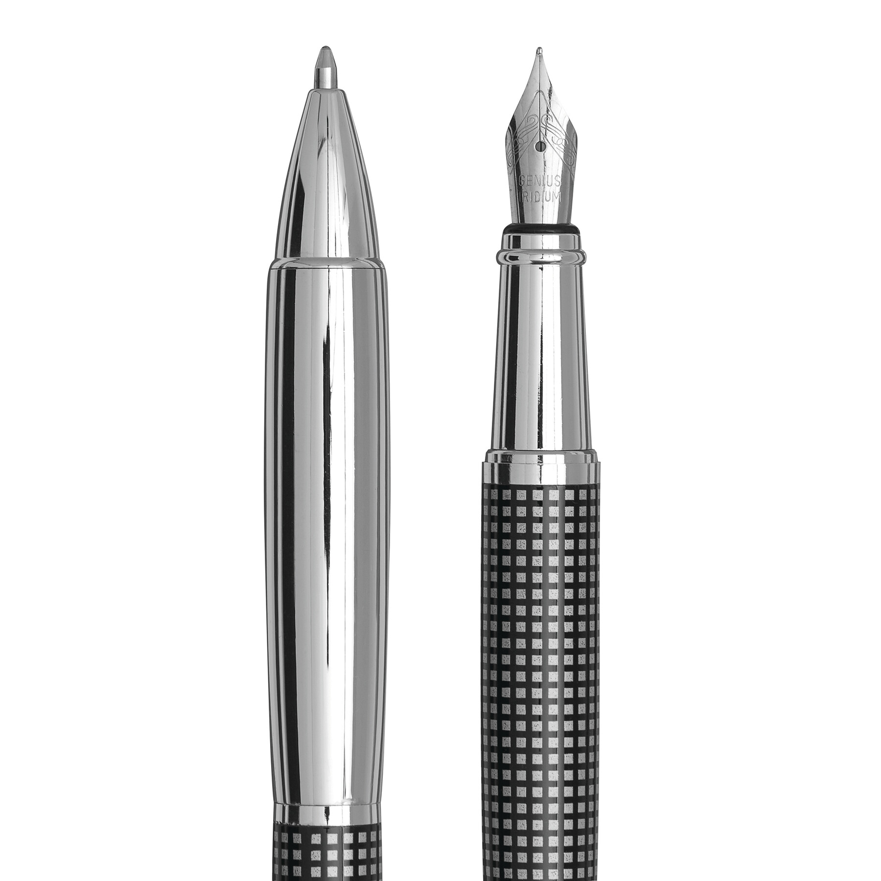 Zestaw piśmienny NOBLESSE, metalowe pióro wieczne i długopis z mechanizmem przyciskowym (niebieski tusz), ze wzorkiem w kratę, zapakowany w pudełko.
