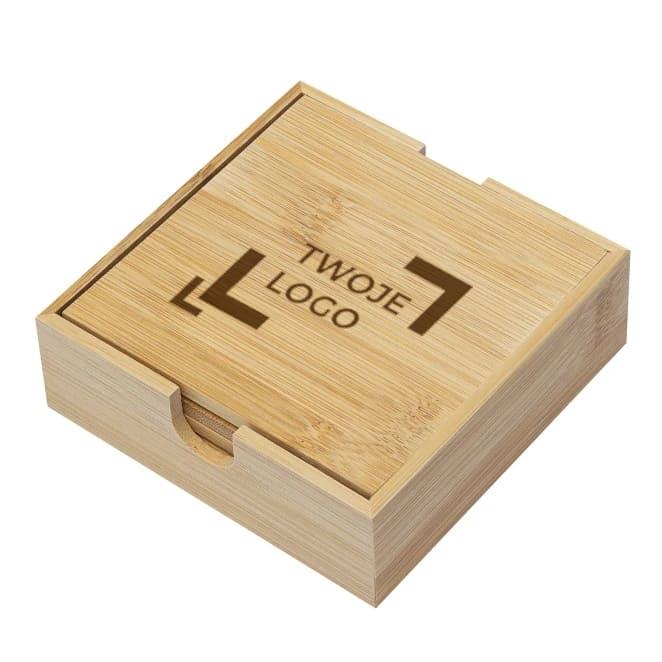 Zestaw podstawek PUT UNDER składający się z 4 podstawek i pudełka bambusowego. Z dużą przestrzenią na umieszczenie logo.