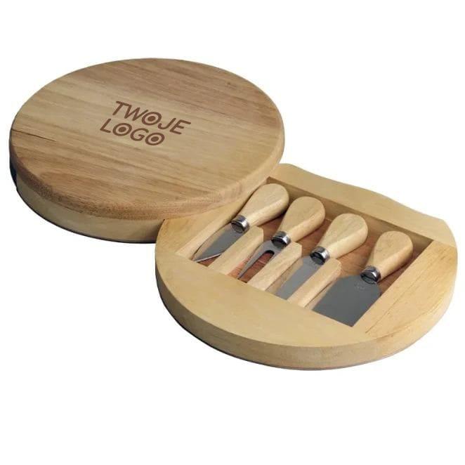 Pomysłowy zestaw do sera składający się z zamykanej obudowy z drewna kauczukowego, która jest jednocześnie deską do krojenia, trzech noży oraz widelca ze stali nierdzewnej.