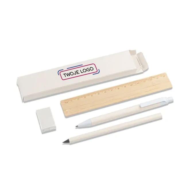 Zestaw szkolno-biurowy wykonany z papieru pochodzącego z recyklingu kartonów po mleku. Składa się z długopisu z niebieskim wkładem, "wiecznego" ołówka, bambusowej linijki i gumki. Całość zapakowana w pudełko.