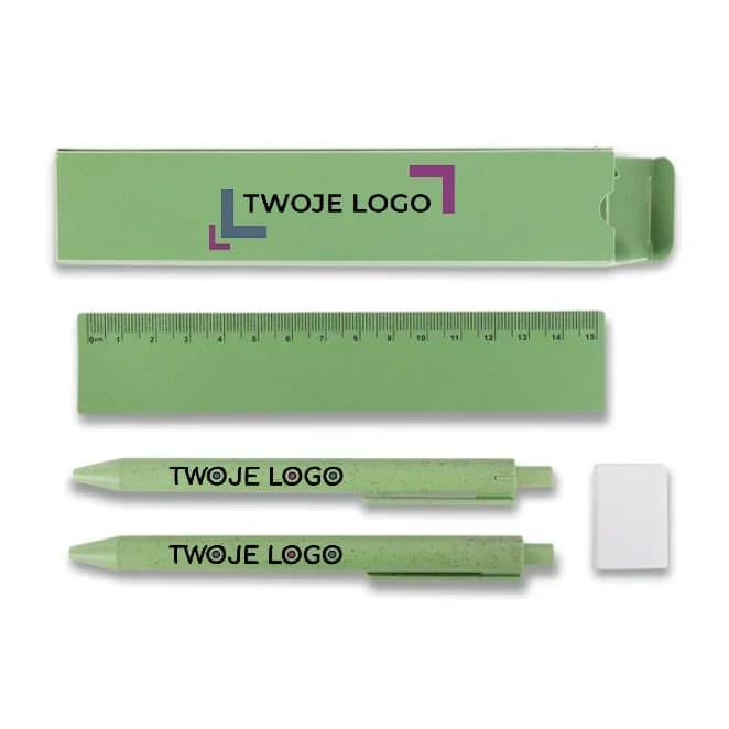 Zestaw szkolno-biurowy ze słomy pszenicznej. Składa się z długopisu, ołówka automatycznego, linijki i gumki. Całość zapakowana w pudełko. Niebieski wkład.