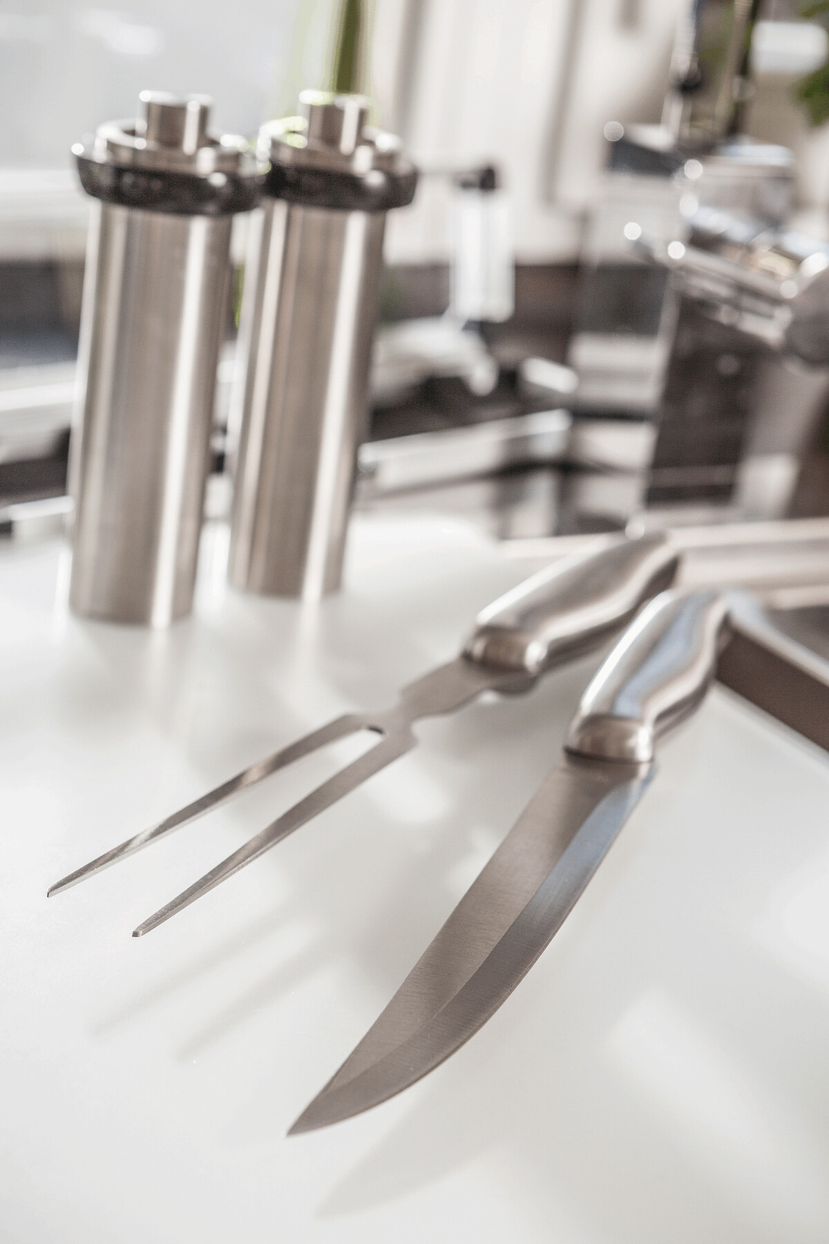 Zestaw sztućców ROASTBEEF wykonanych ze stali nierdzewnej, zawiera nóż i widelec, zapakowany w aluminiowe etui z przezroczystą pokrywką.