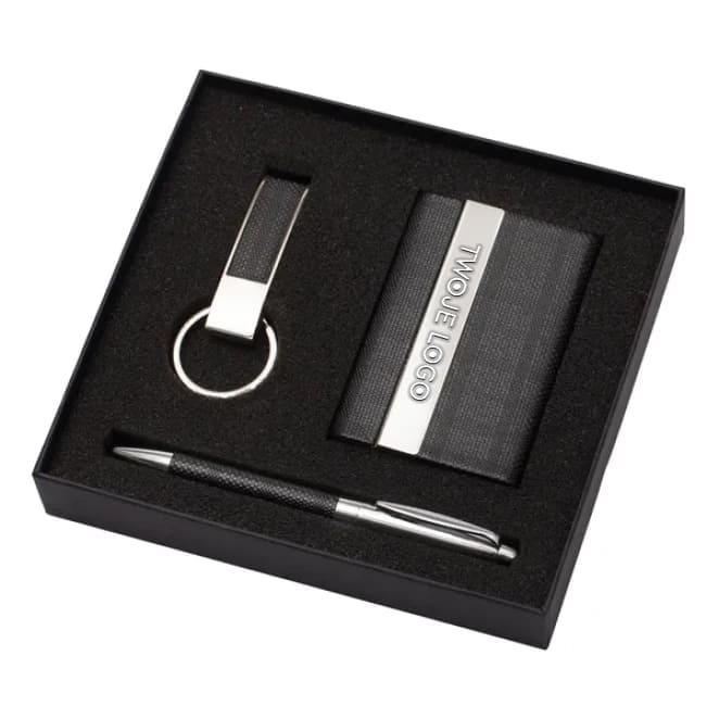 Wykonany z metalu i ekoskóry zestaw upominkowy składający się z breloka, wizytownika na 15 wizytówek i długopisu wyposażonego w niebieski wkład. Pakowany w opakowanie upominkowe.