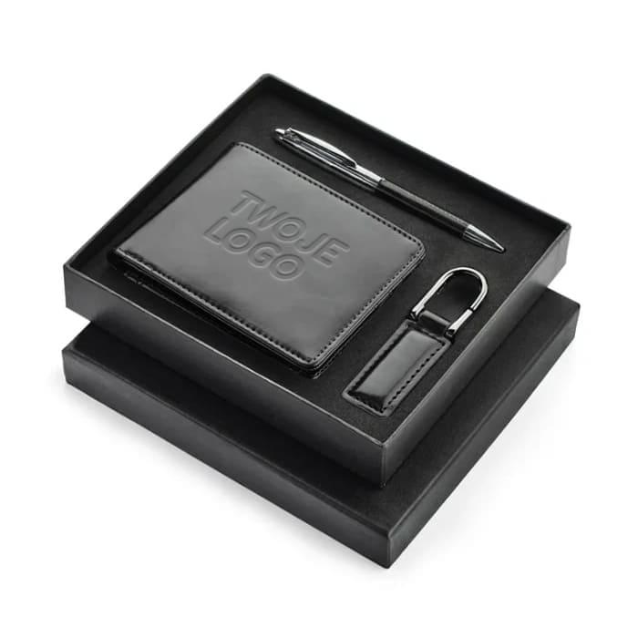 Komplet upominkowy zawierający portfel, brelok oraz metalowy długopis. Portfel wykonany z ekoskóry zawiera 2 przegródki na banknoty, kieszeń na bilon oraz dodatkowe kieszenie na karty kredytowe czy paragony. Całość zapakowana w eleganckie czarne pudełko. Grawerujemy na każdym elemencie lub na pudełku. Wymiary produktu 115 x 91 x 15 mm (portfel), 133 x ⌀10 mm (długopis), 65 x 25 x 5 mm (brelok), 181 x 163 x 31 mm (opakowanie)