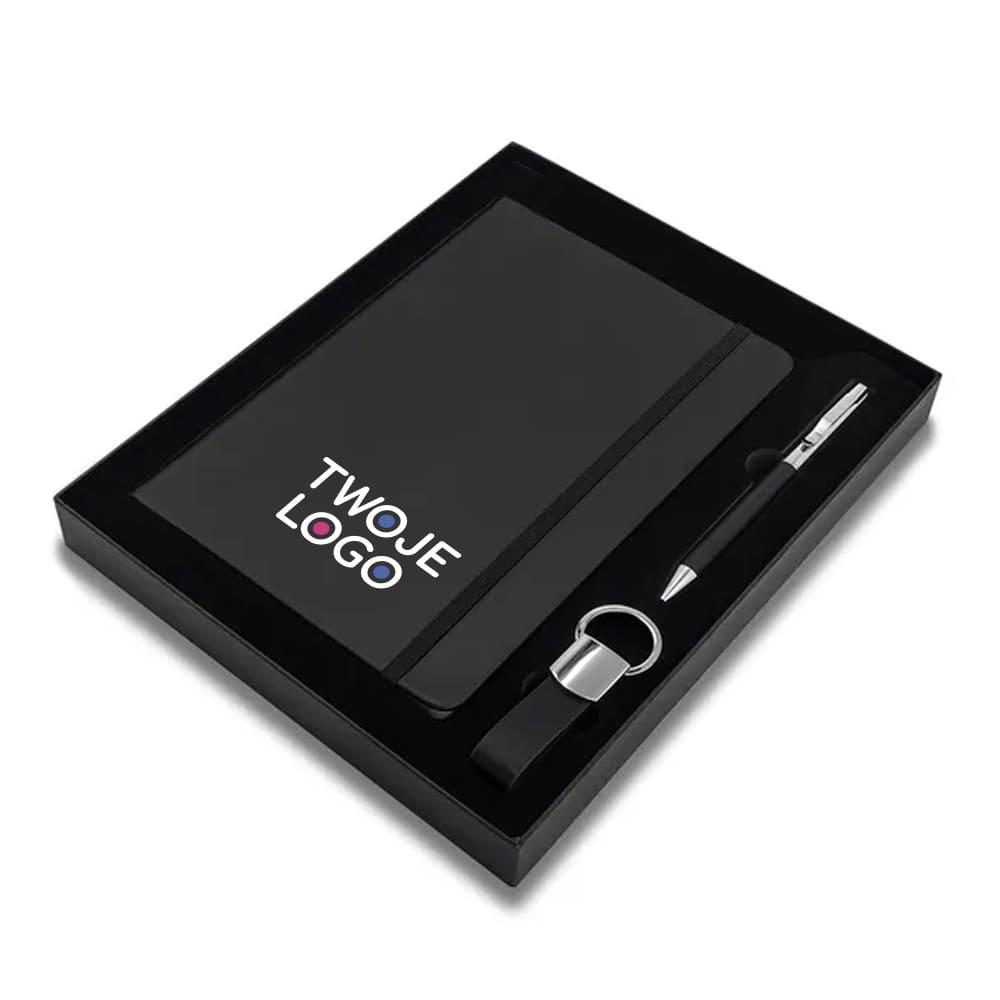 Zestaw upominkowy składający się z notesu A5, długopisu i breloka. Notes w twardej oprawie, 80 kartek w linie (papier 70 g/m2). Długopis wyposażony w niebieski wkład. Brelok do kluczy. Wszystkie elementy w wykończeniu z eko skóry. Zestaw pakowany w czarne pudełko upominkowe.