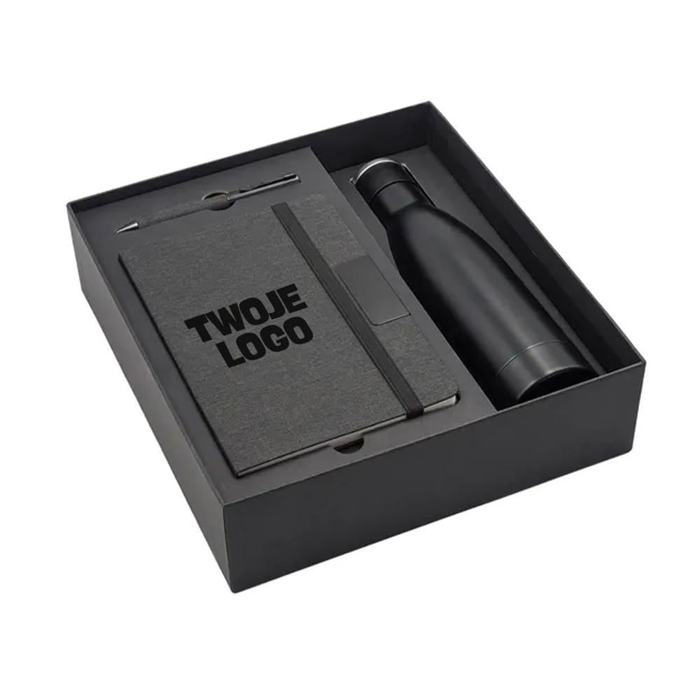 Biznesowy zestaw składający się z butelki próżniowej, notesu i długopisu. Całość zapakowana w eleganckie, czarne pudełko. Butelka próżniowa ze stali nierdzewnej o podwójnych ściankach (stal 18/8 wewnątrz, 18/0 na zewnątrz), ze składanym uchwytem. Utrzymuje temperaturę powyżej 40°C do 15 godzin. Pojemność 500 ml. Notatnik formatu A5, twarda okładka z tkaniny RPET, ozdobiona czarnym metalowym elementem; 80 kartek w kratkę, o gramaturze 70 g/m². Metalowy długopis ozdobiony tkaniną RPET. Niebieski wkład 1,0 mm.