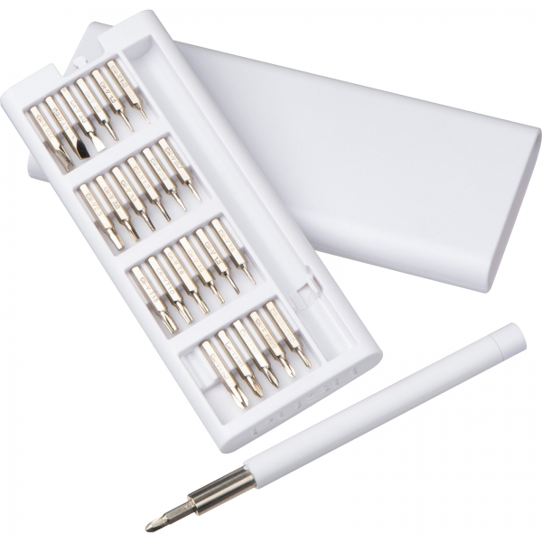 Zestaw 24 magnetycznych wkrętaków ze stali nierdzewnej, umieszczonych w etui ułatwiającym organizacje.