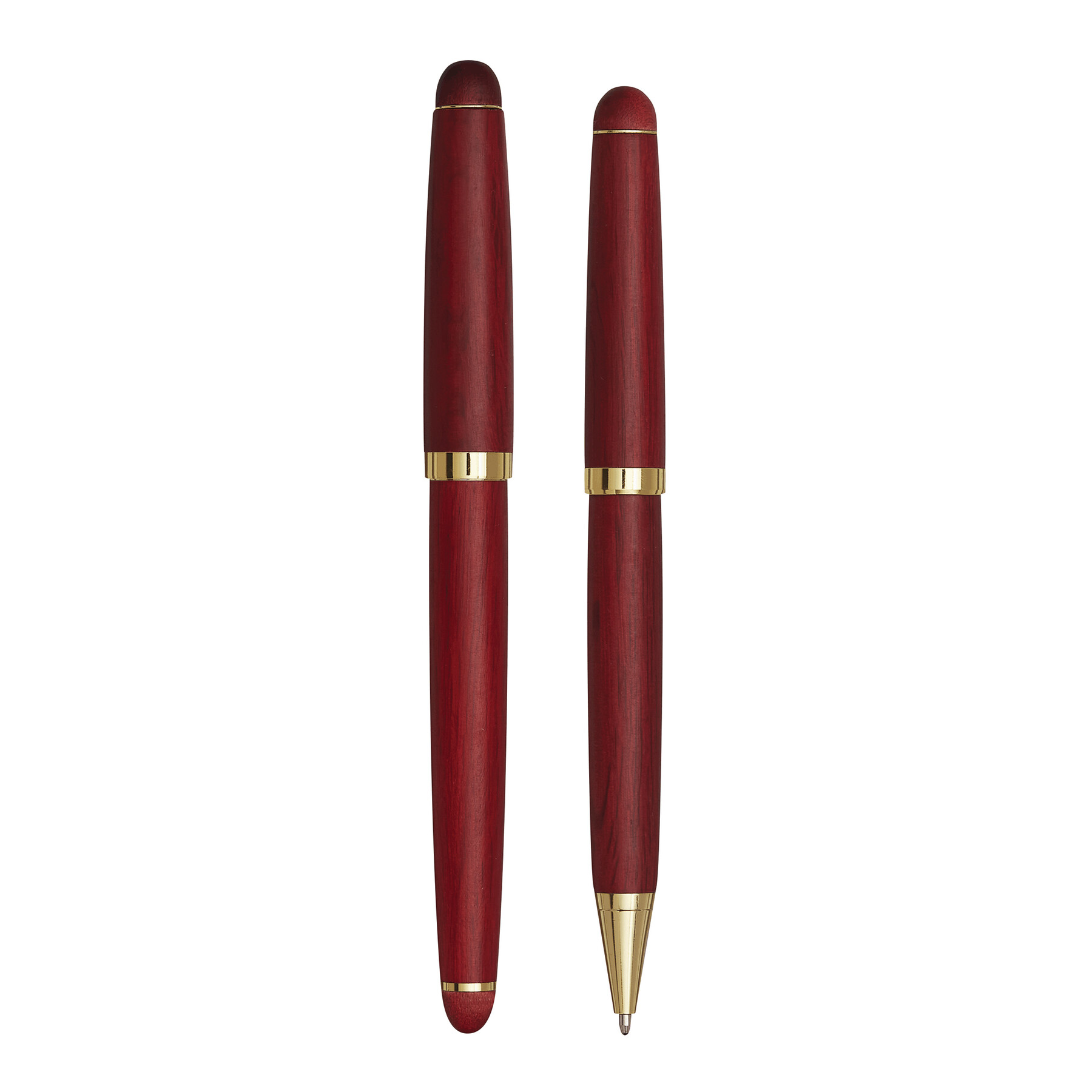 Zestaw z drewna różanego POET składa się z pióra wiecznego i długopisu (niebieski tusz) w etui. Całość z drewna różanego ze złotymi akcentami.